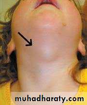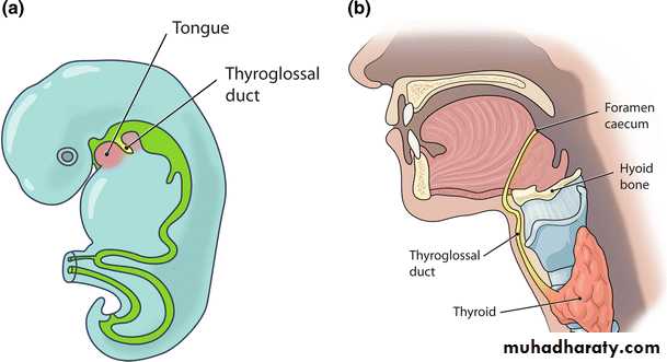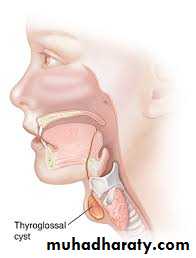 1. Thyroglossal duct cyst:which may arise from any portion of thyroglossal duct they are therefore in a midline position at any point between the thyroid isthmus and the base of the tongue. The cyst may be asymptomatic or may cause symptoms as a result of pressure on other structures. Swallowing will cause the mass to move upward.