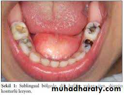 5. Ranula:A ranula is a cyst forming in the floor of the mouth, generally from sublingual gland. The ranula forms in a manner similar to the mucocele but develop to a much larger size. The mucosa is thinned out and the cyst assumes a bluish color. It is non painful lesions. But the tongue may be raised and it's motion obstructed, thus impairing mastication and speech. The ranula is subject to rupture when injured, with escape of a mucoid fluid that re-accumulates as the area heals. The best treatment for a ranula is surgery in the form of marsupialization.