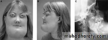 Hyperparathyroidism may be primary due to over production of parathyroid hormone, (adenoma of parathyroid). Alternatively, it may be secondary to the conditions that reduce calcium level in the blood such (chronic renal disease), causing increased production of parathormon helping calcium to be mobilized from the bony skeleton to raise is blood level and this will affect bones In the jaws cyst-like spaces may develop and are known as brown tumor- Mandible is more affected