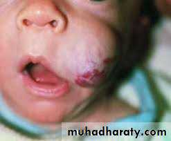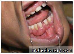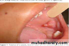 II- Vascularl- Hemangioma- True tumor of endothelium- Most common benign tumor of the childhood- Usually not present at birth- Exhibits a period of rapid postnatal growth and typically involutes slowly until age 5-7 years- Central hemangioma of the facial bones are rare, most have occurred in the mandible where it extended deeply to involve the oral tissue- The gum may be involved becoming congested, edematous and swollen, False pocketing