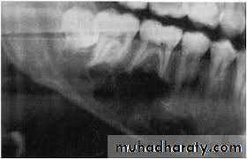 - Radiographically; well circumscribed area of radiolucency with a less defined lamina dura surrounding.