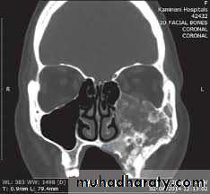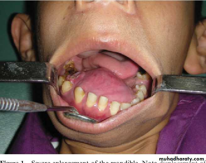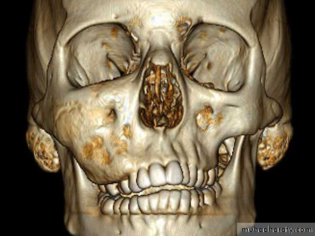 2- Fibrous dysplasia-Affect children- Replacement of normal bone by immature bone with extensive vascular fibrouselements.- Maxilla is more affected- painless enlargement of the maxilla on the affected side , buccal and palatalaspect of the bone may be enlarged and expanded and this may cause spacingbetween the teeth seen as a facial asymmetry of the cheek bone and nasolabial fold.
