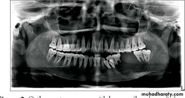 - Radiographically; bilateral multilocular cyst -like radiolucency, teeth seem to be floating within the tumor and may be malformed.- Treatment: surgical contouring is indicated when expansion is sever, leading to functional jaw or airway disturbances, or when the disease causes social problems in the older child. If possible, intervention is delayed until growth has completed.