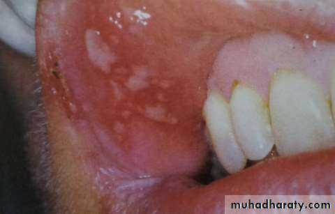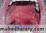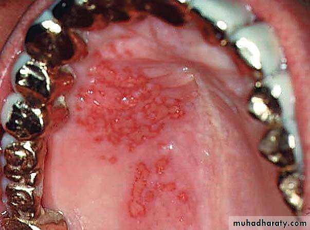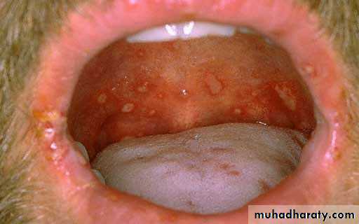 • oral vesicles and ulcers more extensive than herpes(mainly palate, buccal mucosa)