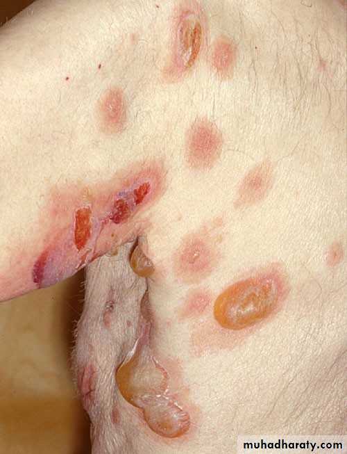 • Bullae appear in oral cavity (posterior region), forming painful ulcers with necrotic fundus and erythematous halo Spontaneous onset of bullae that readily rupture, giving rise to