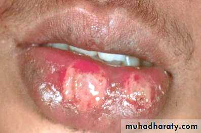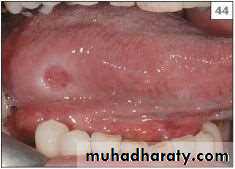 • Occur in midline of the palate or tongue starting as small firm nodular masses and often growing to several centimeters• Necrosis commences within the nodules and produces ulceration in the surface epithelium