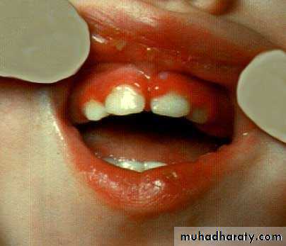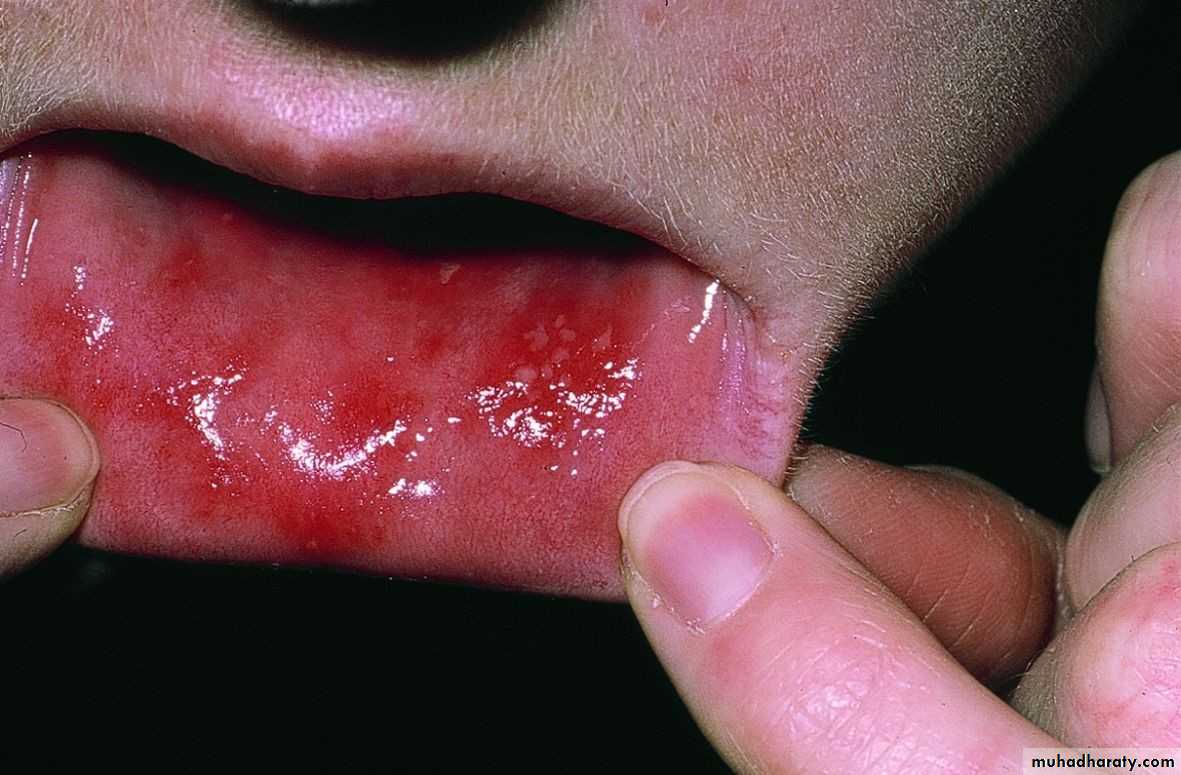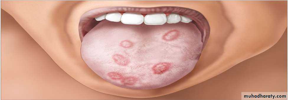 • Develop 3 weeks after inoculation and may persist upto 2 months• Primary oral lesion occurs most often on the lips, on tip of the tongue, in tonsillar region, or on the gingivae – commencing as macules and papules and then ulcerate