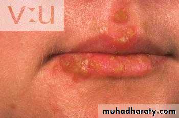 • 3. Recurrent herpes simplex• 1. recurrent herpes labialis common (cold sores, fever blisters (. by fever, menstruation, u.v, emotional stress