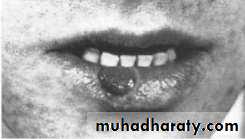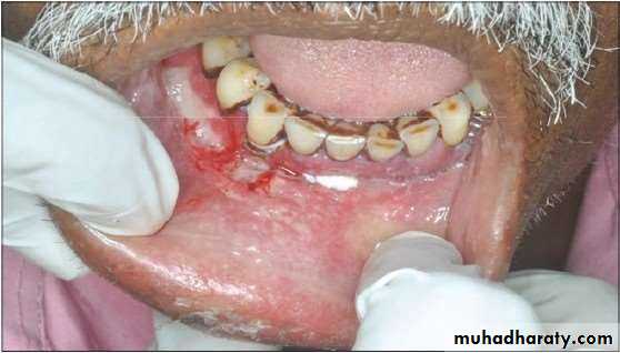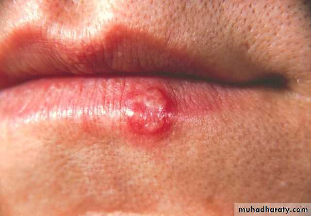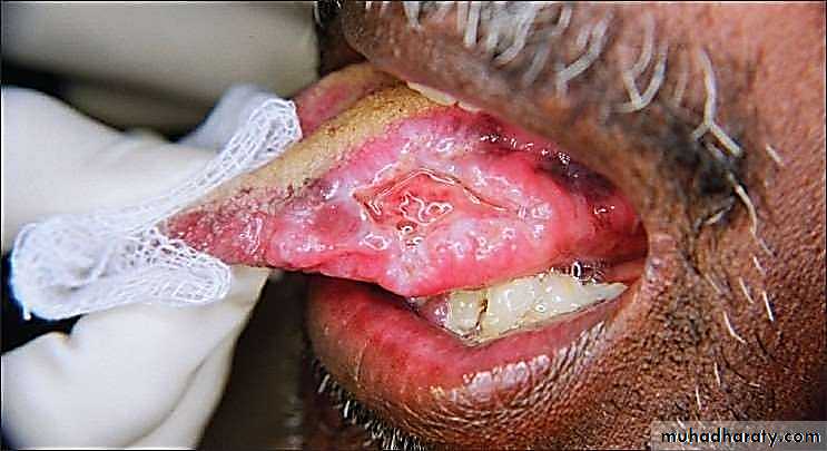 • Ulcer on vermilion border of lip – crusted surface because of absence of saliva