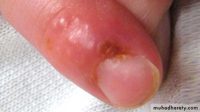 • This may be contracted while working on a patient with the herpetic lesion• Lesions of finger are recurrent and may spread to whole hand