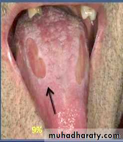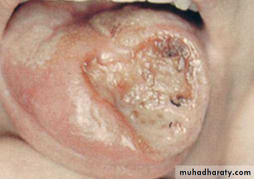 • Primary tuberculosis: deep, irregular, persistent and painful ulcer on the tongue, with rolled border and granulation tissue in the fundus