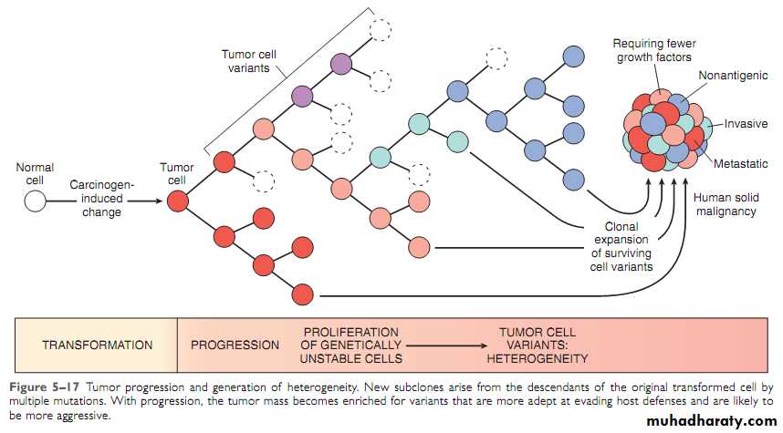 • A tumor is formed by the clonal expansion of a single precursor (progenitor) cell that has incurred genetic damage (i.e., tumors are clonal).