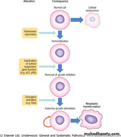 • Autosomal recessive disorder, individuals with inherited disorder of DNA repair, are at increased risk for the development of skin cancer at early age particularly following exposure to the UV light contained in sun rays.Essential steps in neoplastic transformation. Three key genetic events are the minimum needed to convert a normal human cell into a neoplastic cell. Telomerase expression prevents telomeric shortening with each cell division and thus thwarts cellular senescence. Inactivation of tumour suppressor gene function in the immortalised cells removes inhibition of growth control. Oncogene activation sets up autocrine growth stimulation; the cell now produces a growth factor for which it already has a receptor or expresses a receptor for a growth factor it normally produces. The cell is now fully transformed