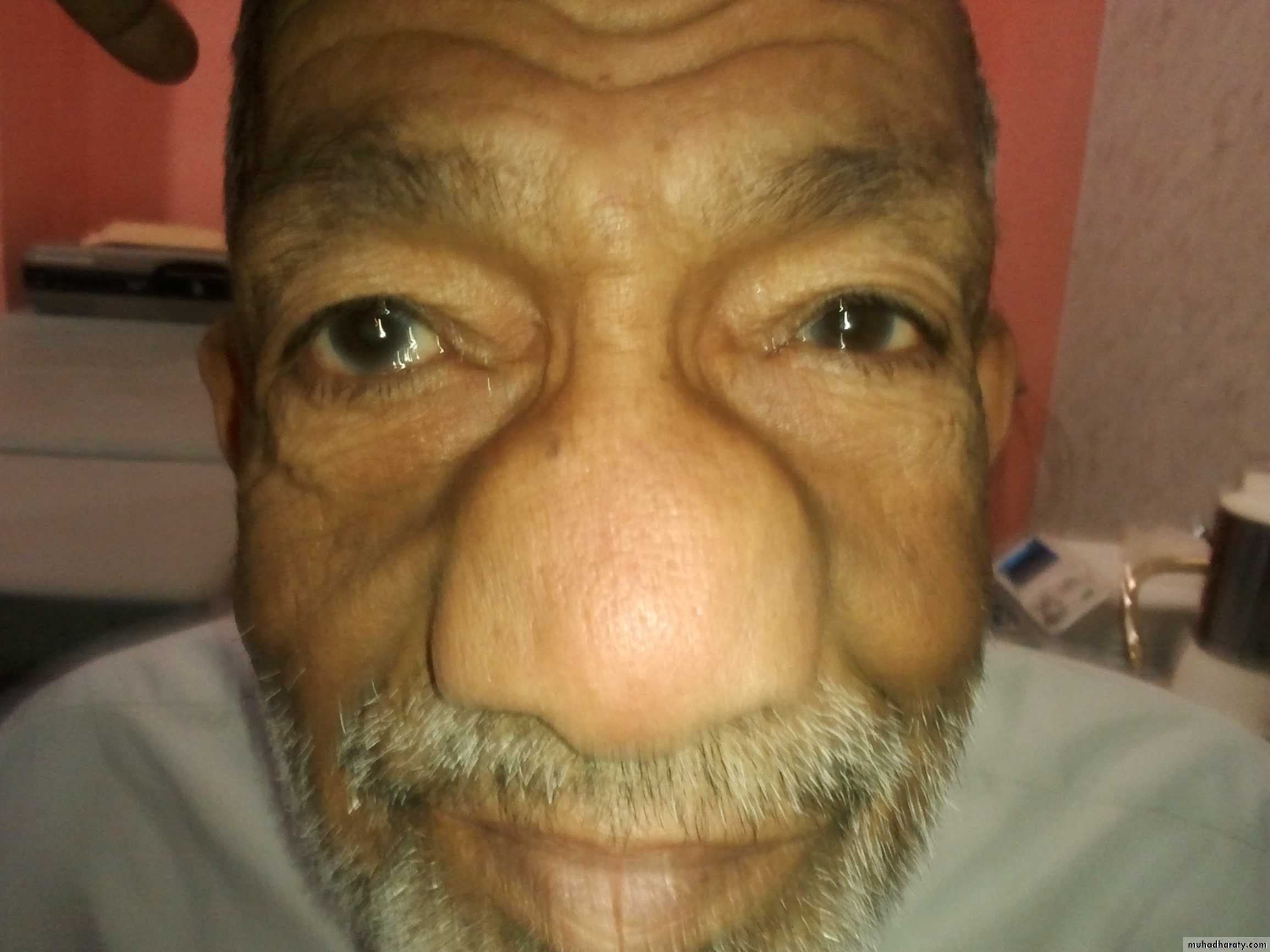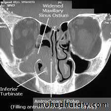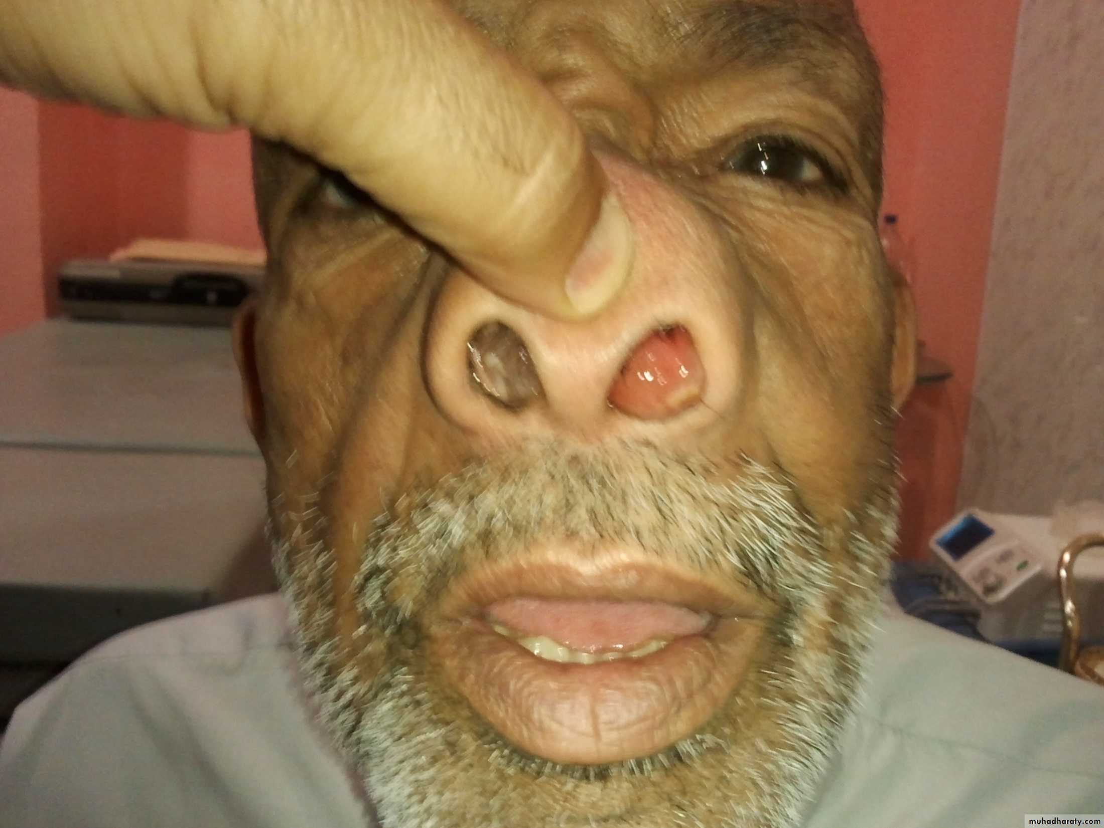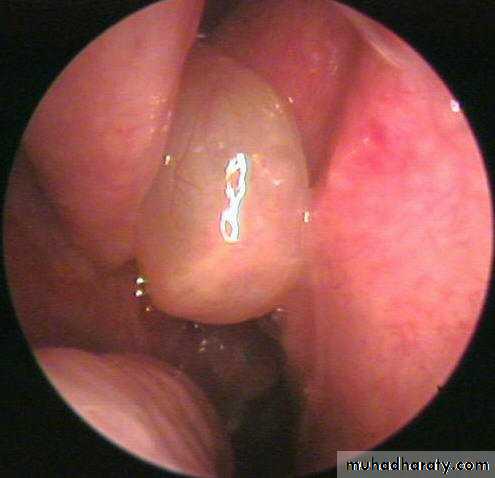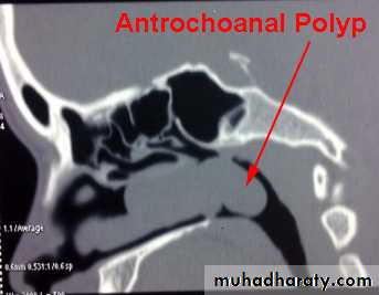• Clinical features Male/ Female; 3/1. Onset usually insidious, but may be sudden and rapid after an acute infection. Nasal obstruction is the chief symptom. Other features : anosmia, epiphora, postnasal 'catarrh' (irritation and drip), headaches, snoring and change in speech tone. Antrochoanal polypus causes marked obstruction, Purulent rhinorrhoea Expansion of the nasal bones ('frog-face'). Diagnosis Biopsy is essential when the polypus is unilateral and haemorrhagic. Radiography CT scan is best