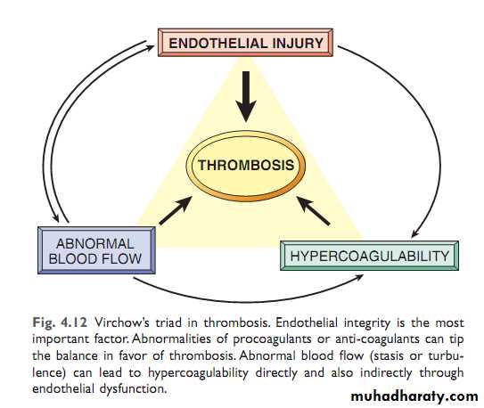 Inappropriate activation of normal hemostatic processPredisposing factors (Virchow triad): 1- Endothelial injury 2- Stasis or turbulence of blood flow 3- Blood hypercoagulability