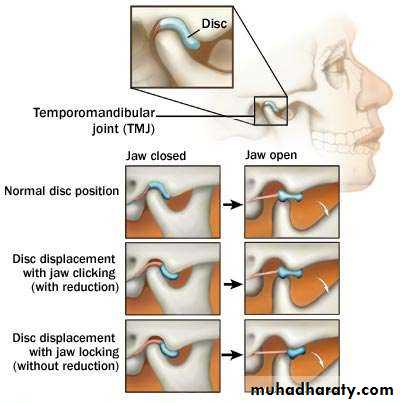 • If the displaced disc does not return to the normal position and acts as an obstacle during attempted mouth opening, the joint appears as locked. This is referred to as disc displacement without reduction
