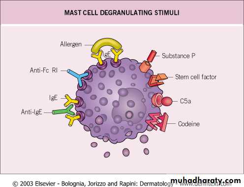 . Types of degranulating stimuli are (1)immunological i.e. penicillin and (2)non-immunological i.e. opiates, NSAIDS