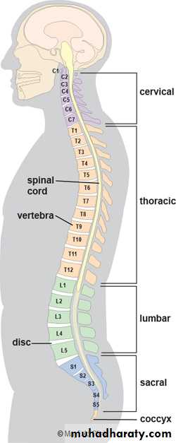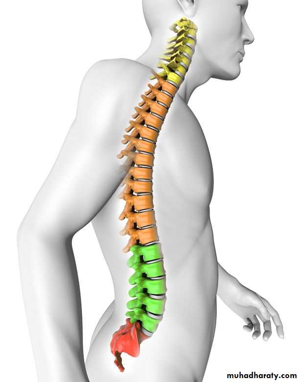 • Cervical - 7 vertebrae• Thoracic - 12 vertebrae• Lumbar - 5 vertebrae• Sacral - 5 fused vertebrae• Coccyx - 4 fused vertebrae