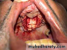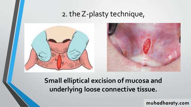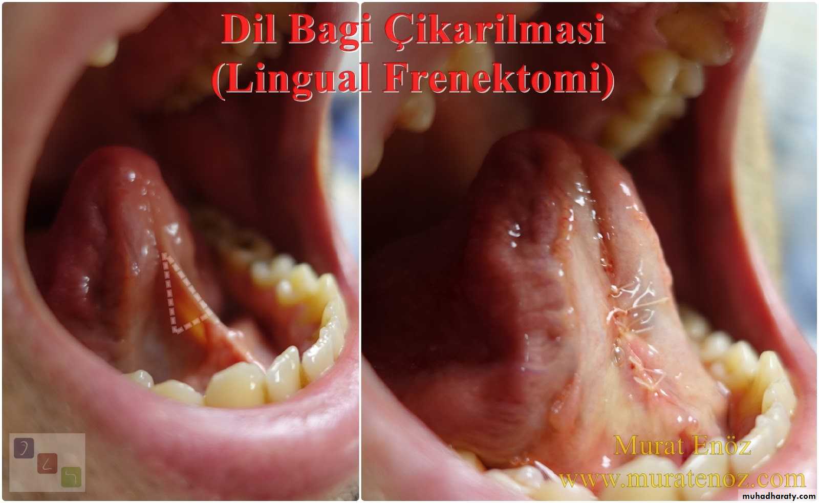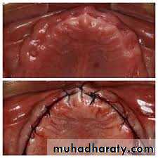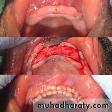 An abnormal frenal attachment usually consists of mucosa, dense fibrous connective tissue. This attachment binds the tip of the tongue to the posterior surface of the mandibular alveolar ridge. Surgical release of the lingual frenum requires incising the attachment of the fibrous connective tissue at the base of the tongue in a transverse fashion followed by closure in a linear direction which completely release easy the anterior portion of the tongue.Transpositional flap vestibuloplasty:-