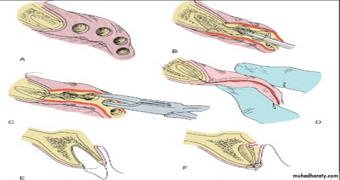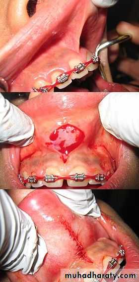 For the simple excision technique a narrow elliptic in around the frenal area down to the periosteum, The fibrous fernium is sharply dissected from the underlying periosteum and soft tissue then the margins of the wound are gently undermined and re-approximated. Placement of the first suture should be at the maximum depth of the vestibule and should include both edges of mucosa and underlying periosteum.