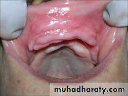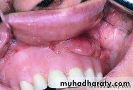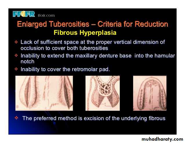 I.F.H also called epulis or denture fibrosis is a generalized hyperplasic enlargement of mucosa and fibrous tissue in the alveolar ridge or vestibular area. Which aest fitting dentures. most often result from ill- 2 technique can be used either electrosurgical or laser techniques provide good results for tissue excision or by grasping the tissue with tissue forceps. A sharp incision is made at the base of fibrous tissue down to the periosteum the adjacent tissue is gently under mined and re approximated using interrupted or continuous sutures.