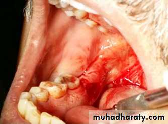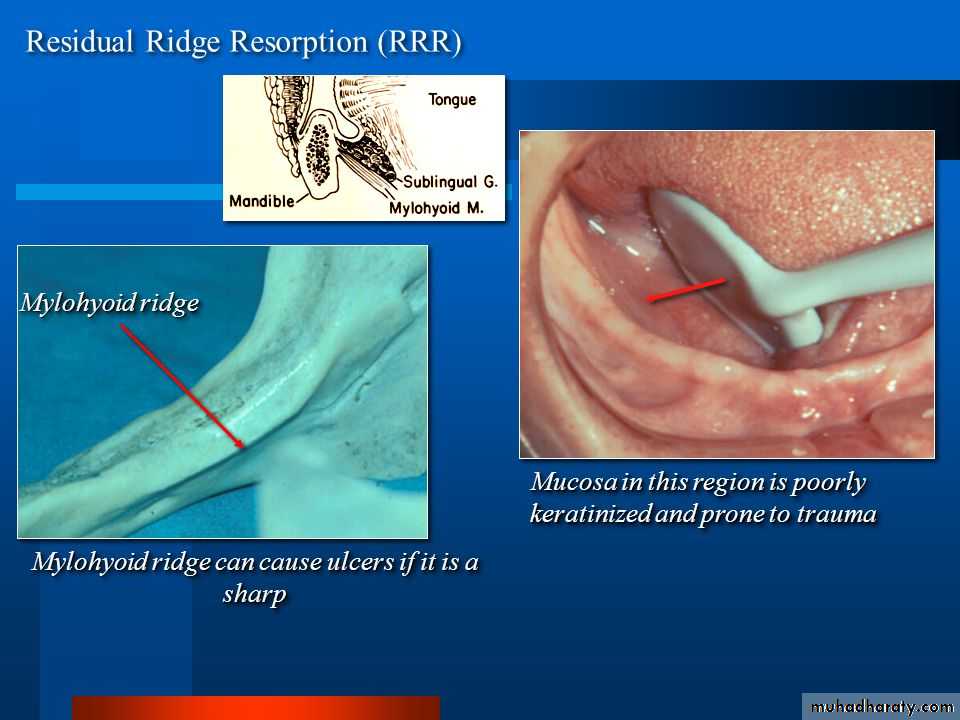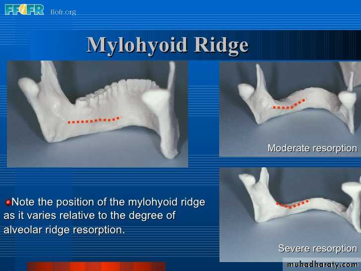 One of the more common area interfering with proper denture construction in the mandible is the mylohyoid ridge with it's easily damaged covering of mucosa, the muscular attachment to this area often is responsible for dislodging the denture. When this ridge is extremely sharp, denture pressure may produce significant pain in this area.Inferior alveolar, buccal and lingual nerve blocks are required a linear incision is made over the crest of the ridge in the posterior aspect of the mandible. Extension of the incision too far to the lingual aspect should be avoided because this may cause potential trauma to the lingual nerve. A full-thickness mucoperiosted flap is reflected which exposed the mylohyoid ridge area and muscle Attachments. This attachment are removed from the ridge by sharply incising the muscle attachment At the area of bony origin.