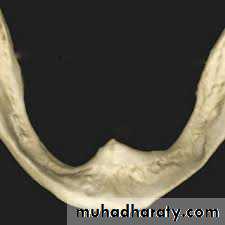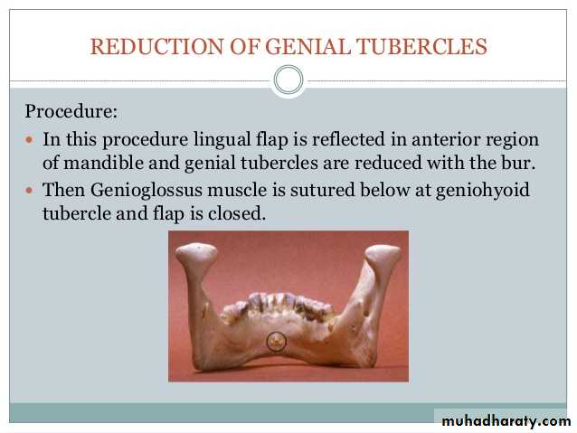 As the mandible begins to undergo resorption. The area of the attachment of the genioglossus muscle in the anterior portion of the mandible may become increasingly prominent. Which require reduction to construct the prosthesis properly. Before a decision to remove the prominence is made consideration should be given to possible augmentation of the anterior border of the mandible rather than reduction of the g. tubercle. If augmentation is the preferred treatment the tubercle should be left to add support to the graft in this area.Maxillary Tori:-