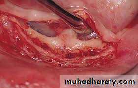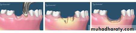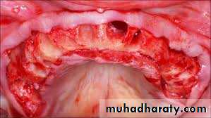 bur in a hand piece. Alone or in combination. In any case normal saline irrigation should be used throughout the procedure to avoid overheating and bone necrosis. after that the flap should be re-approximated by digital pressure and the ridge palpated to ensure that all irregularities have been removed.