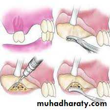 Access to the tuberosity for the bone removal is accomplished by making a crest of incision that extends up to the posterior aspect o Tubrosity area, reflection of a full thickness mucoperiosted flap is completed in both the buccal and palatal direction, bone can be removed using aside-cutting Rongeur or rotary instrument with care taken to avoid perforation of the floor of the maxillary sinus after the appropriate amount of bone has been removed the area should be smoothed with a bone file and irrigated with saline. The mucoperiosted flaps can then be re-adapted