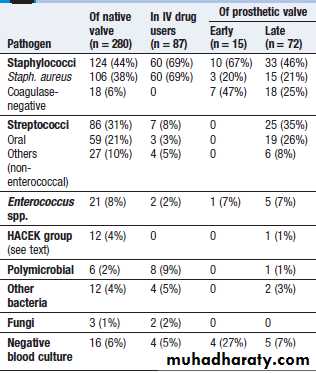 Over three-quarters of cases are caused by streptococci or staphylococciStrep. milleri and Strep. bovis endocarditis is associated with large-bowel neoplasms.