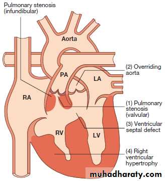 Children are usually cyanosed but this may not be the case in the neonateThe subvalvular component of the RV outflow obstruction is dynamic and may increase suddenly under adrenergic stimulation