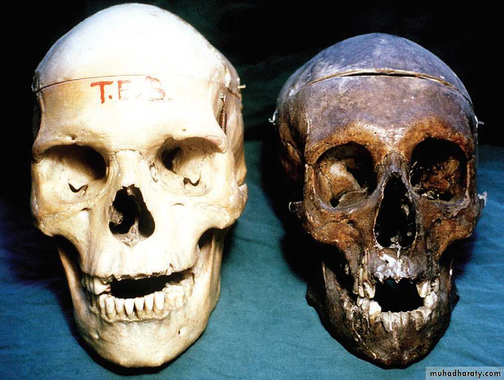 17• الجمجمة: تتميز جمجمة الذكر البالغ عن جمجمة الانثى بثقلها وخشونة ملمسها وكبر حجمها. وبكون النتوء الخشاوي والحرف القذالي بارزين وخشنين وكذلك الامر بالنسبة للجسر فوق الحجاج. تكون الزاوية الجبهية الانفية متميزة في جمجمة الذكر بينما تكون ضحلة في جمجمة الانثى. الوجيه اللقمي لقاعدة الجمجمة عريضا وقصيرا في جمجمة الانثى بينما يكون ضيقا اسطوانيا في جمجمة الذكر.. يتميز الفك السفلي عند الذكر بضخامته جسمه وارتفاع ارتفاقه الذقني وعرض ساقه الصاعد وحدة الزاويو بين الجسم والساق هع ضخامة اللقمة الفكية. بينما في الانثى يكون الفك السفلي صغيرا ناعم الملمس قليل الارتفاع عند ارتفاقه والقسم الصاعد ضئيلا واللقمة الفكية صغيرة.