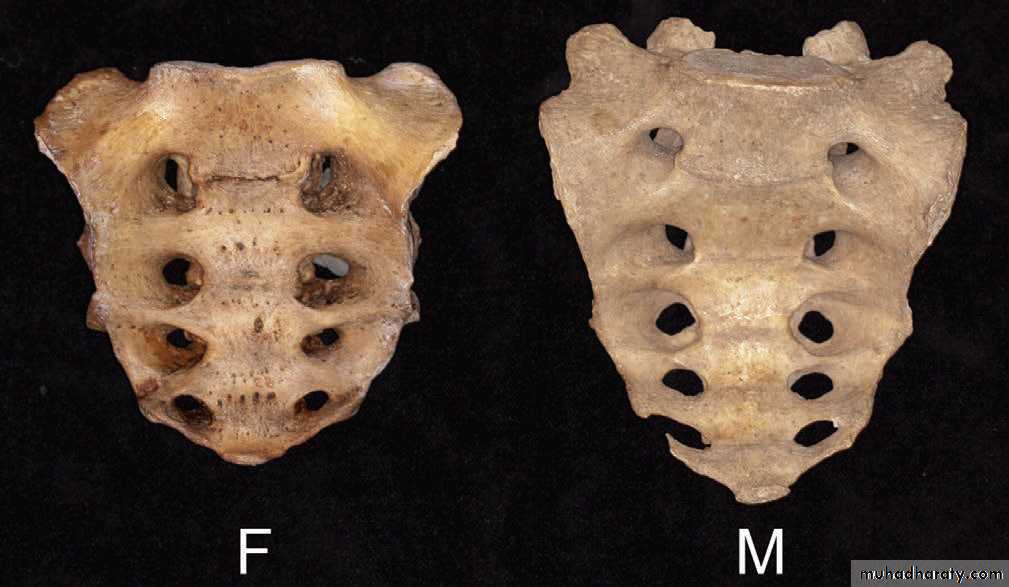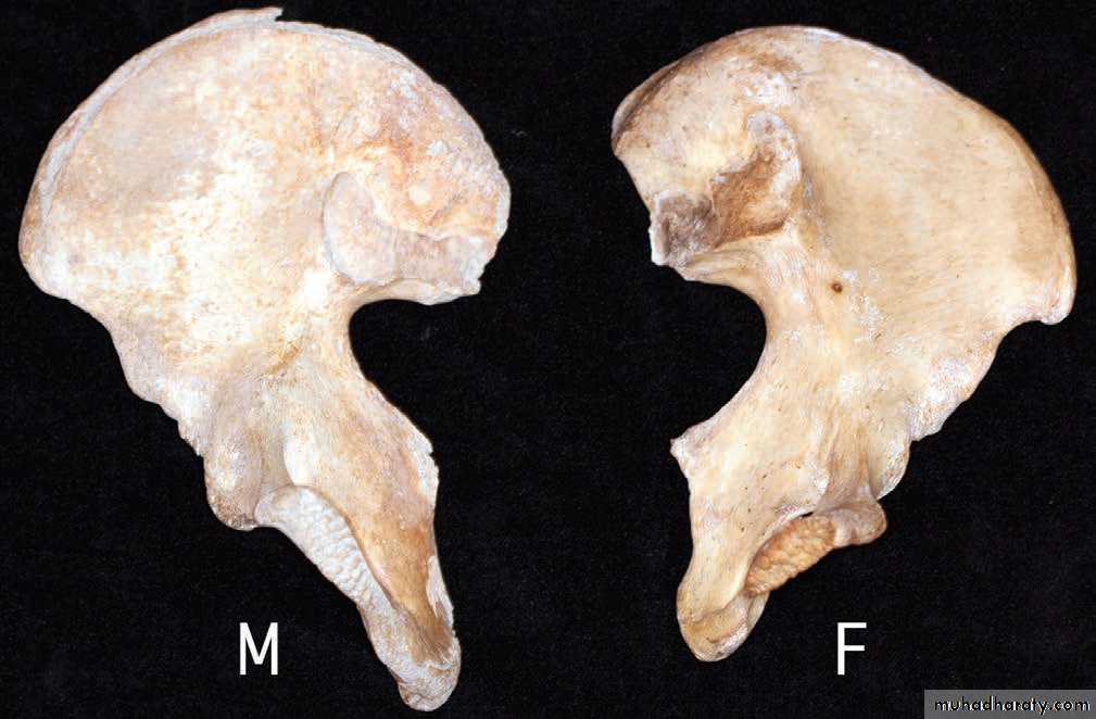19• يكون عظم الحرقف مفلطحا منبسطا وعرفه مندفعا للخارج في حوض الانثى, بينما يكون مقعرا وحرفه مندفعا الى الاعلى و معقوفا نسبيا الى الداخل في حوض الذكر. الحوض الصادق دائري وواسع عند الانثى بينما يكون عند الذكر ضيقا ومثلث الشكل. الزاوية تحت العانية واسعة (منفرجة )عند الانثى بينما تكون حادة (ضيقة) عند الذكر ونفس الامر ينطبق على الثلمة النساوية. اماعظم العجز فيكون قصيرا وعريضا ومنبسطا في نصفه العلوي عند الانثى بينما يكون طويلا ضيقا ومنحنيا للداخل عند الرجل.