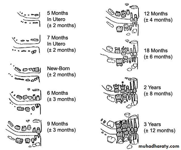 ز) بزوغ الضواحك الثانية في نهاية السنة الثانية. و هكذا يصبح عدد الاسنان اللبنية عشرة في كل فك في بداية السنة الثالثة.