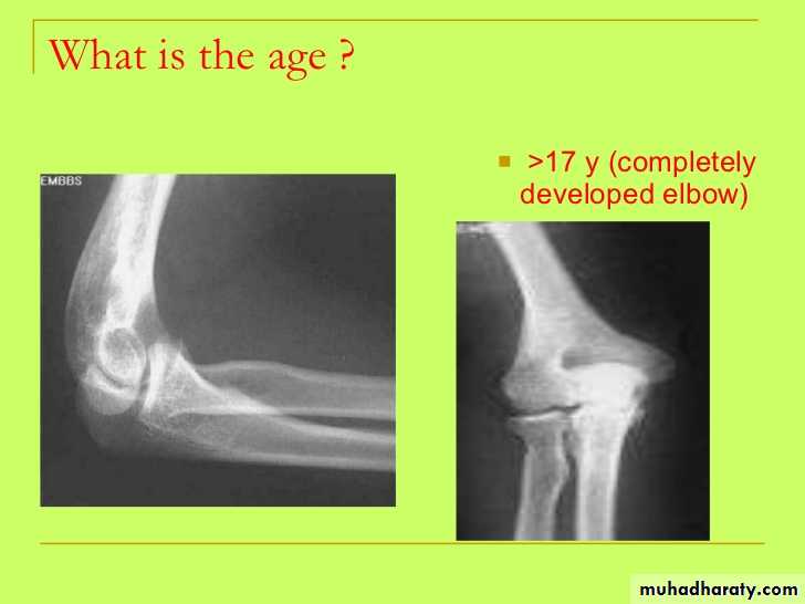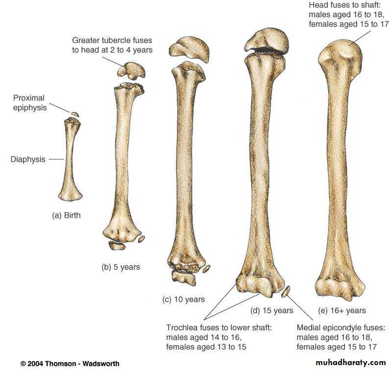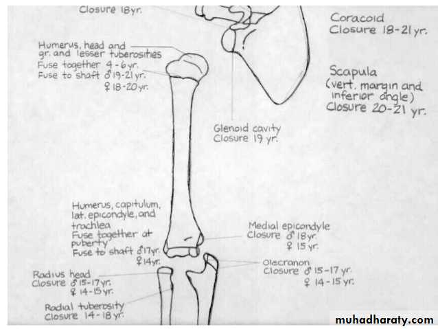3) في سن 16-17 سنة تلتحم اللقمة الانسية بعمد العضد.