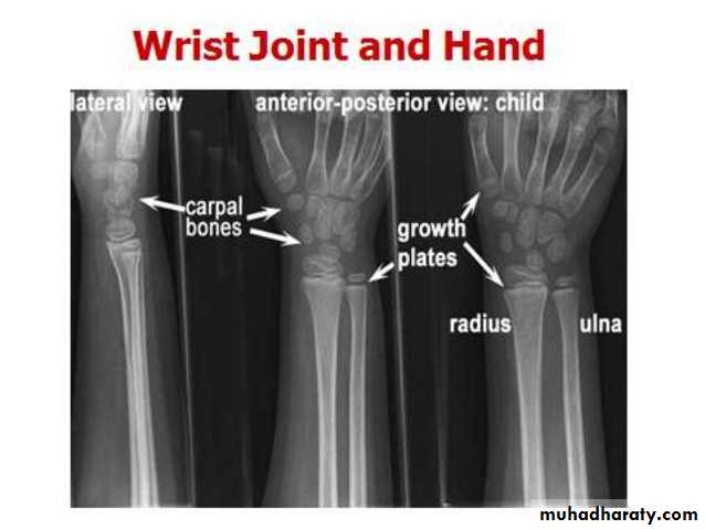 • 4) وفي بداية السنة الخامسة يظهر متع للعظم المربع المنحرف وفي نهاية السنة االخامسة يظهر المركز التعظمي لعظمي شبه المنحرف والزورقي الرسغيين.