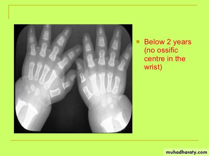 • 2) السنة الثانية يظهر المركز التعظمي للعظم الهلالي الرسغي.