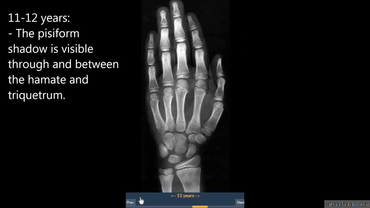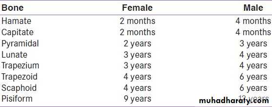 7) في نهاية السنة التاسعة يظهر متع للنتوء المرفقي لعظم الزند والعظم الحمصي.