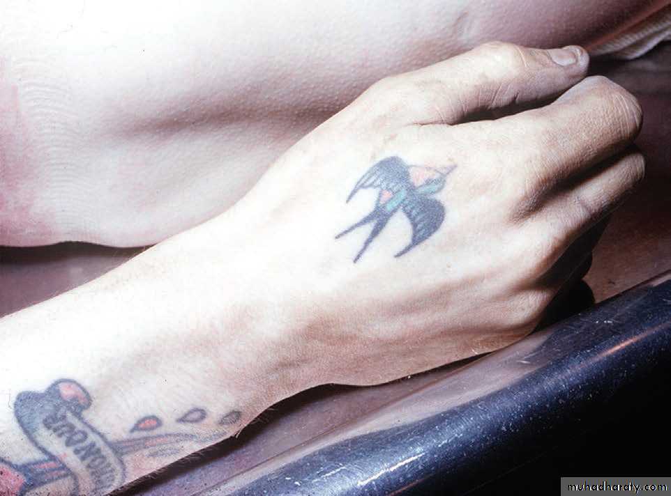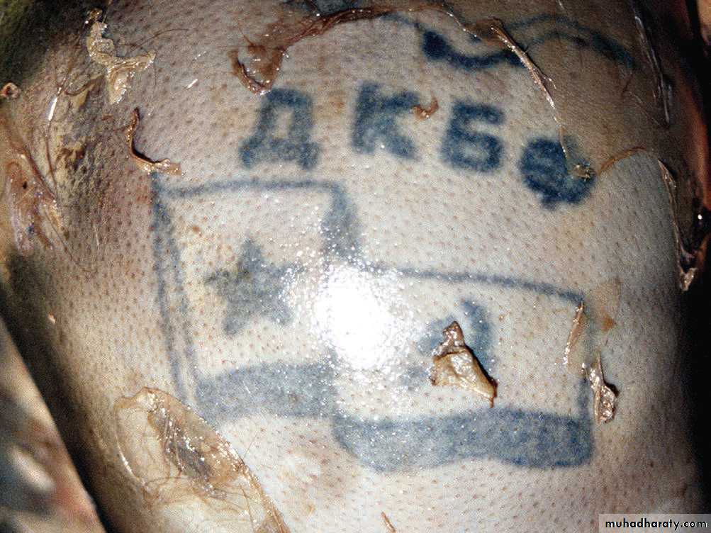 • د) للدلالة على مهنة صاحب الوشم, اذ ان البحار غالبا ما يرسم صورة مرساة سفينه على ساعده, ووشم الاسد يدل على القوة, ويستخدم الوشم من قبل الجندي لكتابة اسمه على الساعد كي يتعرف عليه اهله اذا قتل في الحرب. يصبح الوشم اكثر وضوحا في الجثث المتفسخة بسبب انسلاخ البشرة.