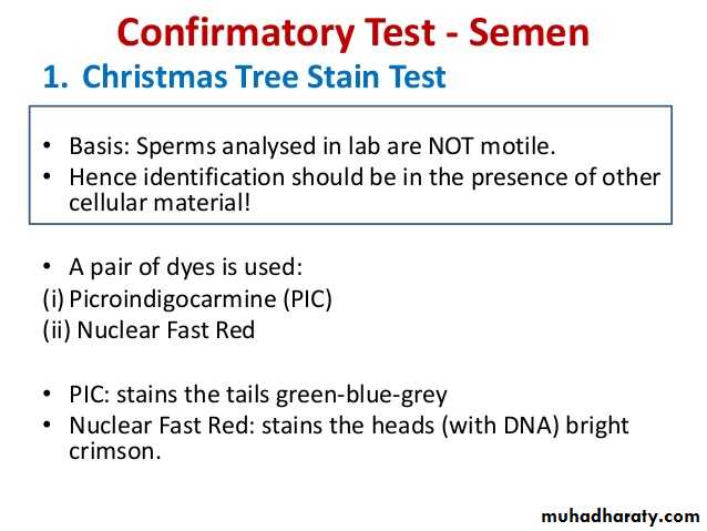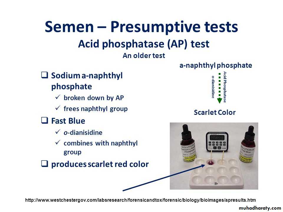 • الاختبارات التشخيصية للمني تعتمد تحري مادة الفوسفات الحمضي بمقدار 300 وحدة كنك ارمسترونك في 1سم3 من المني.