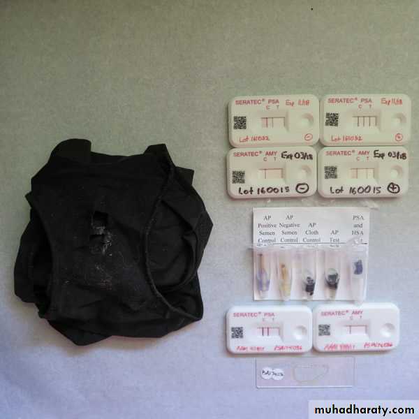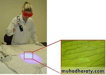 71• يتحول المني عند جفافه على الاقمشة الماصة الى بقعة ذات ملمس صلب خشن وبهيئة تشبه الخارطة ويكون لون البقعة اصفر او اصفر ضارب الى اللون الرمادي. ترسل الملابس التي تحتوي بقعا يشتبه بكونا منيوية كاملة بينما تكشط البقعة المشتبه بها منوية من على السطوح الصقيلة.