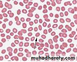 Peripheral blood film in chronic renal failure showing red cell acanthocytosis and numerous ‘burr’ cells.