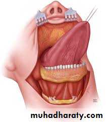 The excision of the lesions should include at least 1 cm of adjacent normal tissues as safe margin. Superficial lesions of the floor of mouth, buccal mucosa and soft palate can be excised through per-oral approach, also T1 and most T2 lesions of the anterior two thirds of the tongue(oral tongue) where the mobility of the tongue is not restricted, and the tumor does not extend to involve the adjacent floor of the mouth or cross the midline are amenable for partial glossectomy through per-oral approach.