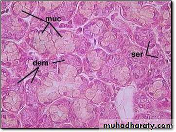 • A mucous acinus secretes mucin-lubricants• In mixed serous – mucous acinus, the serous acinus forms a serous demilune around mucous acinus