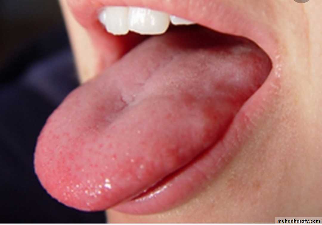 • 5-Oral mucosal conditions (erythema/erosion of whatever cause, atrophic tongue, geographic tongue, lichen planus, pemphigoid, pemphigus)