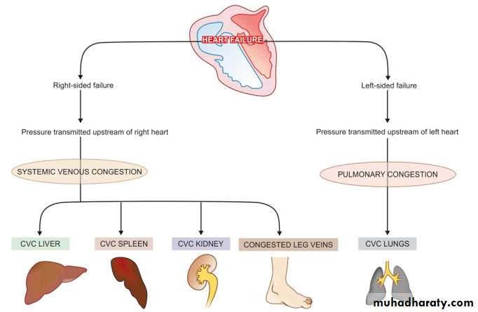 Schematic representation of mechanisms involved in chronic venous congestion (CVC) of different organs.