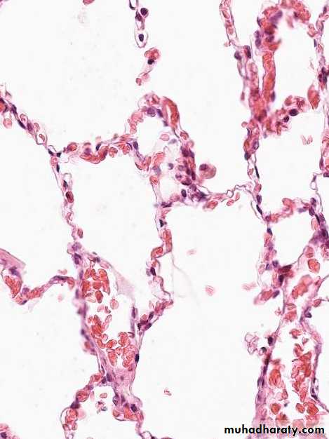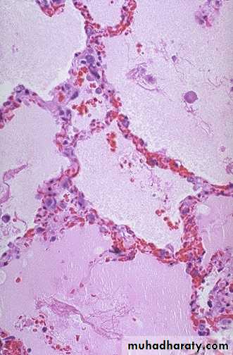 Alveolar capillaries engorged with blood with transudate inside of the alveoliACUTE CONGESTION, LUNG