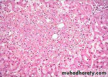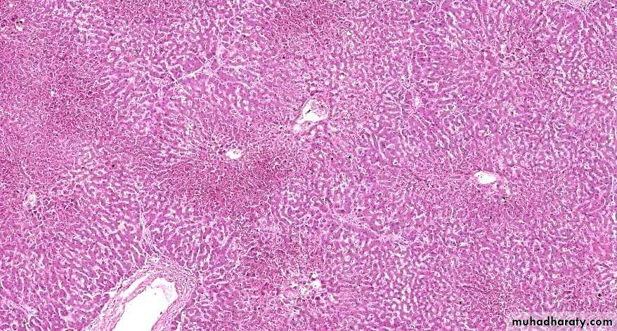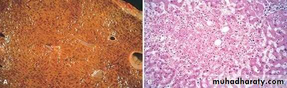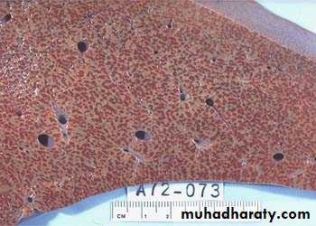 - Central lobules grossly depressed because of loss of cells & appear red brown the surrounding zones uncongested tan, sometimes fatty liver, (nutmeg liver).- Hemosiderin laden macrophages