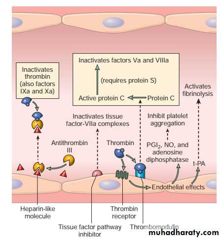 Anticoagulant effects: These effects are mediated by Membrane-associated heparin-like molecules and by thrombomodulin → activation of anticoagulant protein (protein C).