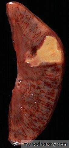 (Infarctions of the spleen (wedge –shaped pale areas caused by obstruction of spleenic artery
